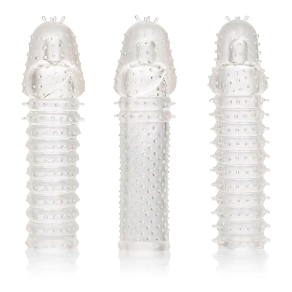 The 3 Piece Extension Kit is a set of 3 super tight, close-end extension sleeves with a ribbed texture inside and out for intense stimulation. These enlarging enhancer sleeves wrap tight to increase girth, length and explosive pleasure for everyone involved. The erotic enhancer sleeves ultra-stretchy material and spacious chamber is made to fit even the biggest man.