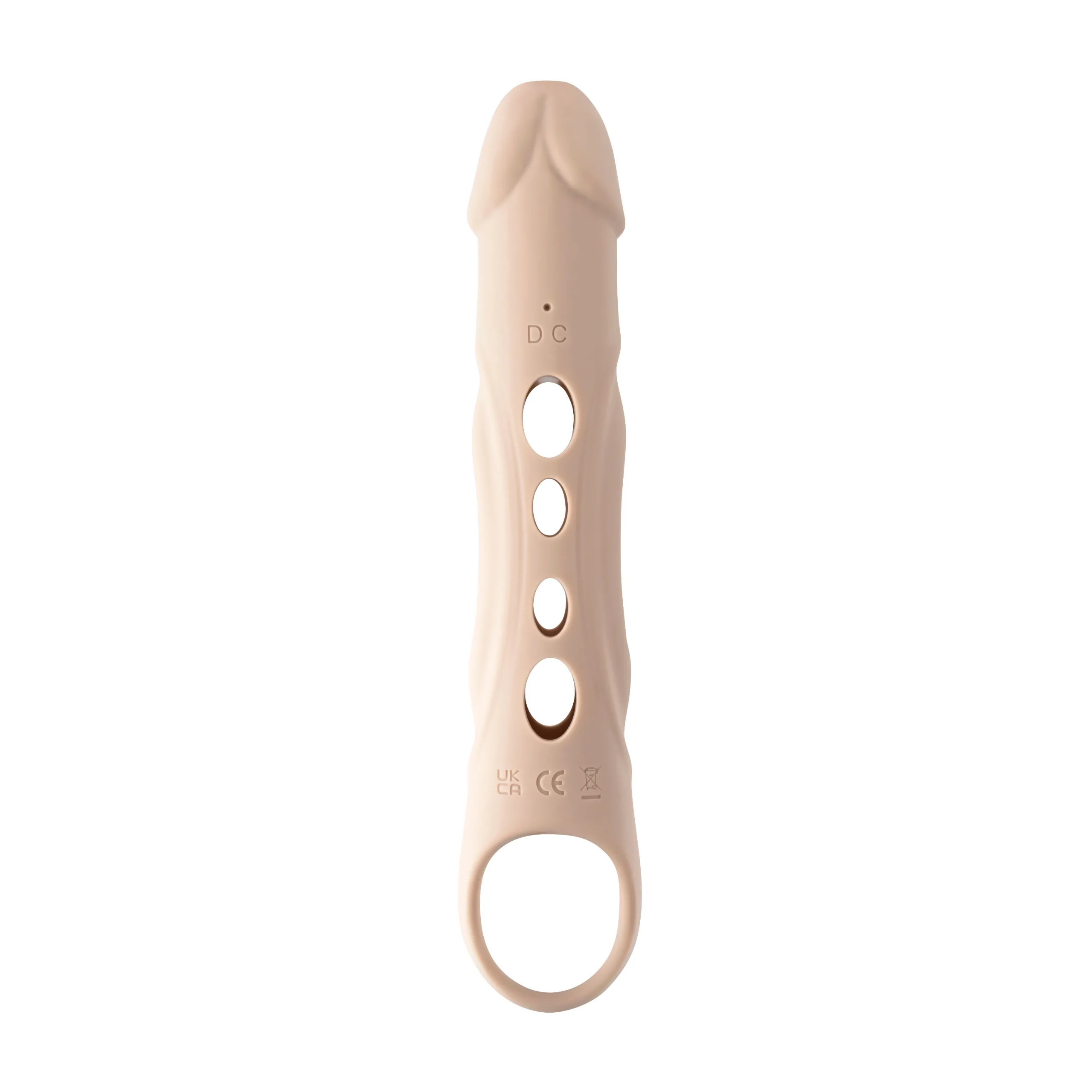 Increase your member with this remote-control penis extender thats comfy and pliable and vibrates in 10 speeds! Nestle your balls into the end loop and enjoy the peek-a-boo holes throughout the shaft as it buzzes all around you. Let the life-like head with its realistic crown ridge add to your natural length, even under water as its fully submersible. USB rechargeable, easy to clean, 25 remote range.