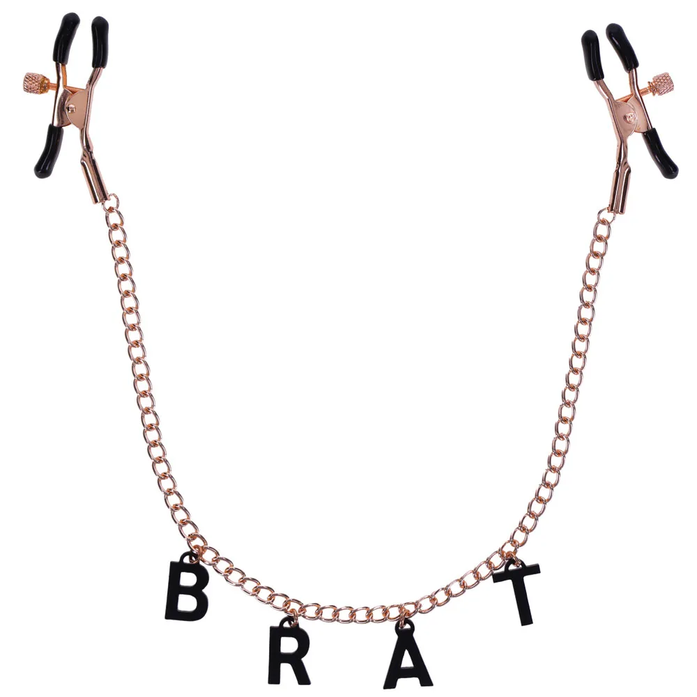 Embrace your brattiest attributes and proudly display your naughtiness with the Brat Charmed Nipple Clamps! Adjust the tension and explore pleasure at every intensity with the rubber tipped, rose gold chained nipple clamps. Own every teasing quality you love with the black charms stretched across the chain labeling you for what you love to be, a BRAT