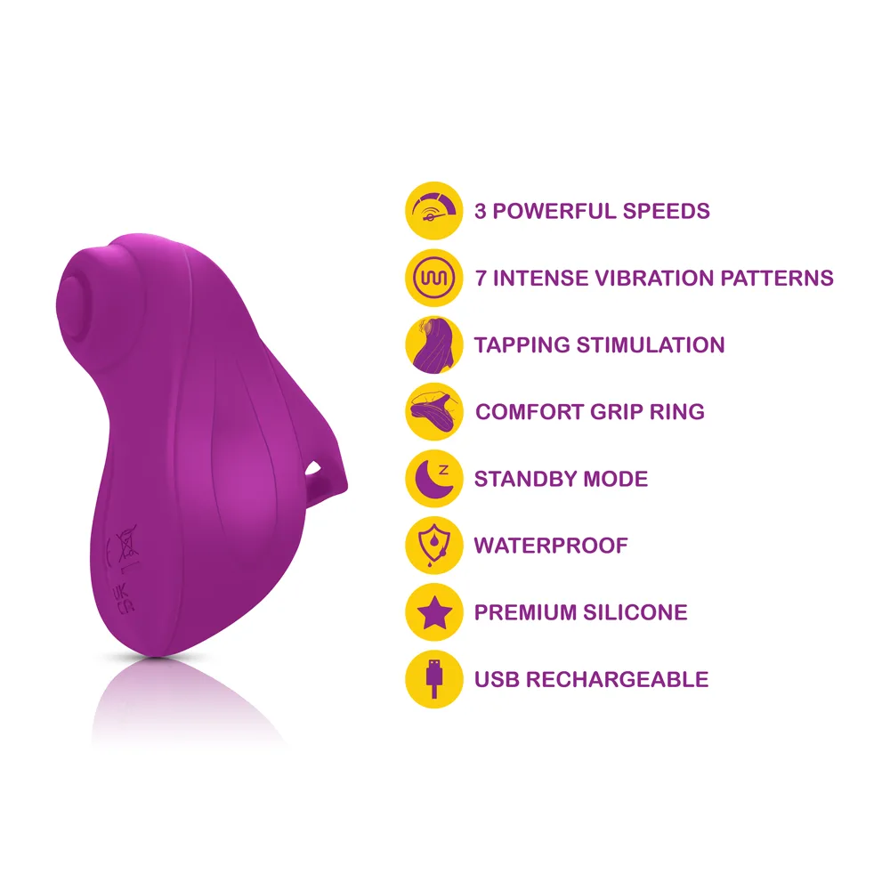 Powerful tapping finger-vibe, travel-friendly stimulator for couples and solo play. Ergonomic design featuring comfort grip finger loop. USB rechargeable, waterproof and made of body safe premium silicone. Easy on/off button control.