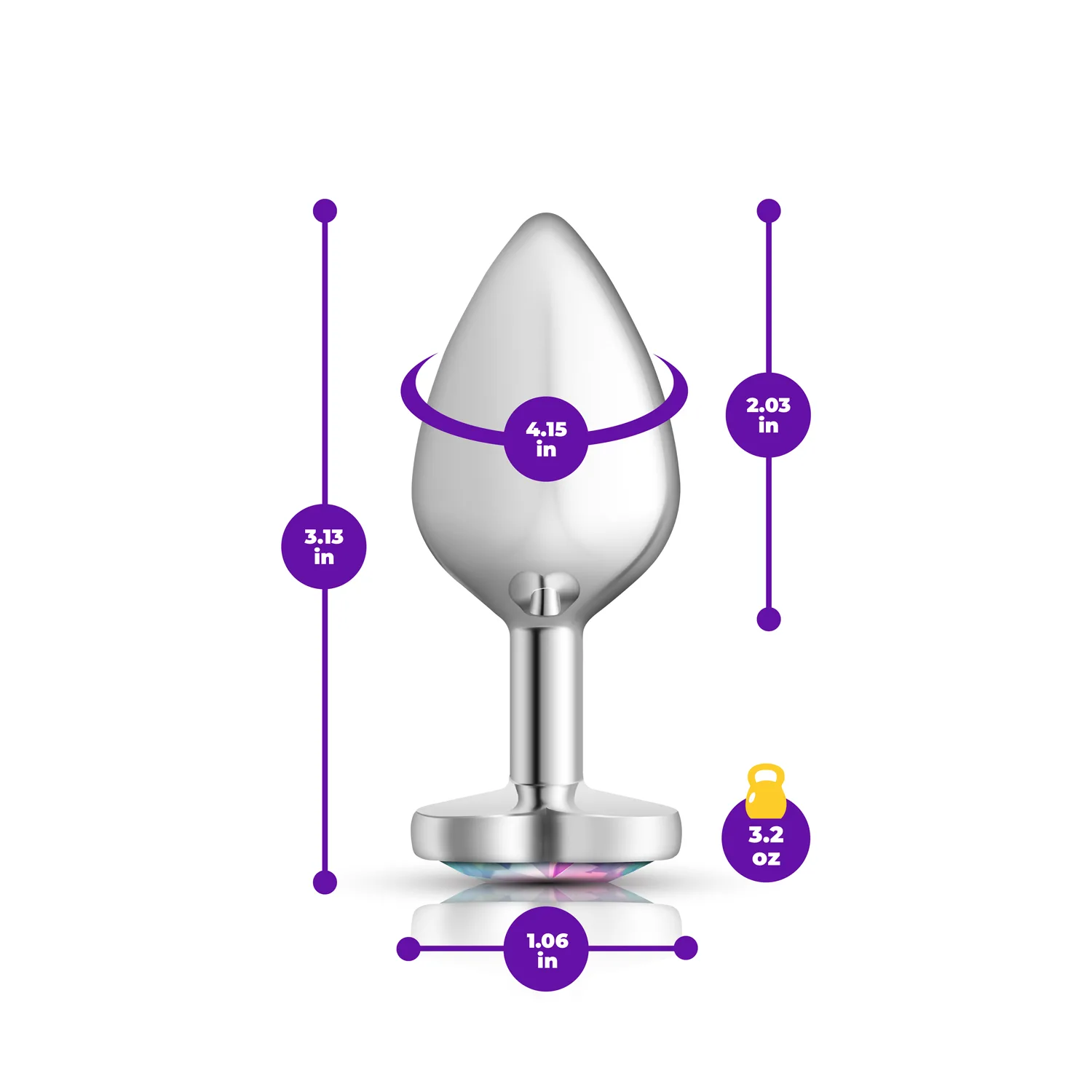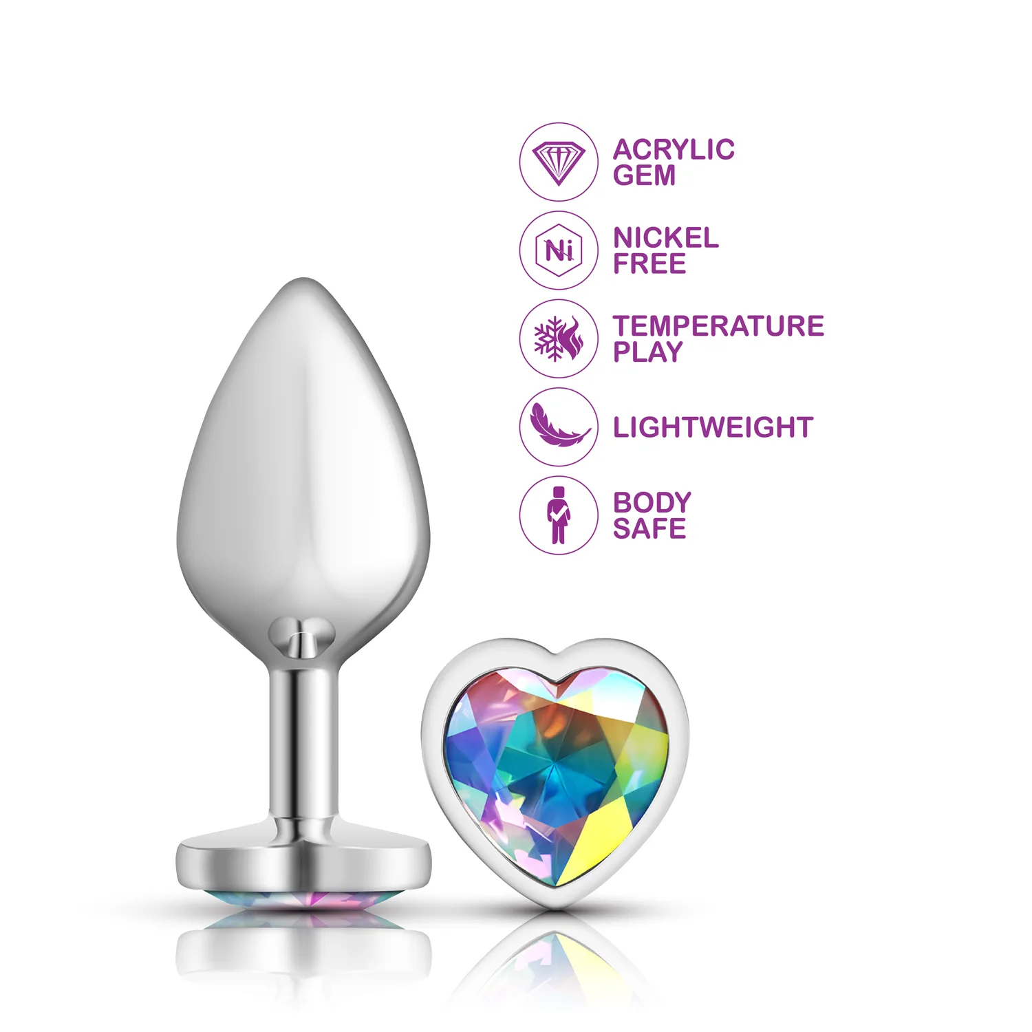 Medium, silver metal, teardrop shaped anal plug with sparkling clear iridescent colored, heart shaped acrylic gemstone. Hypoallergenic, nonporous, body safe, nickel free, aluminum alloy, anal jewelry compatible with all lubricants. Easy to clean and dishwasher safe butt plugs.