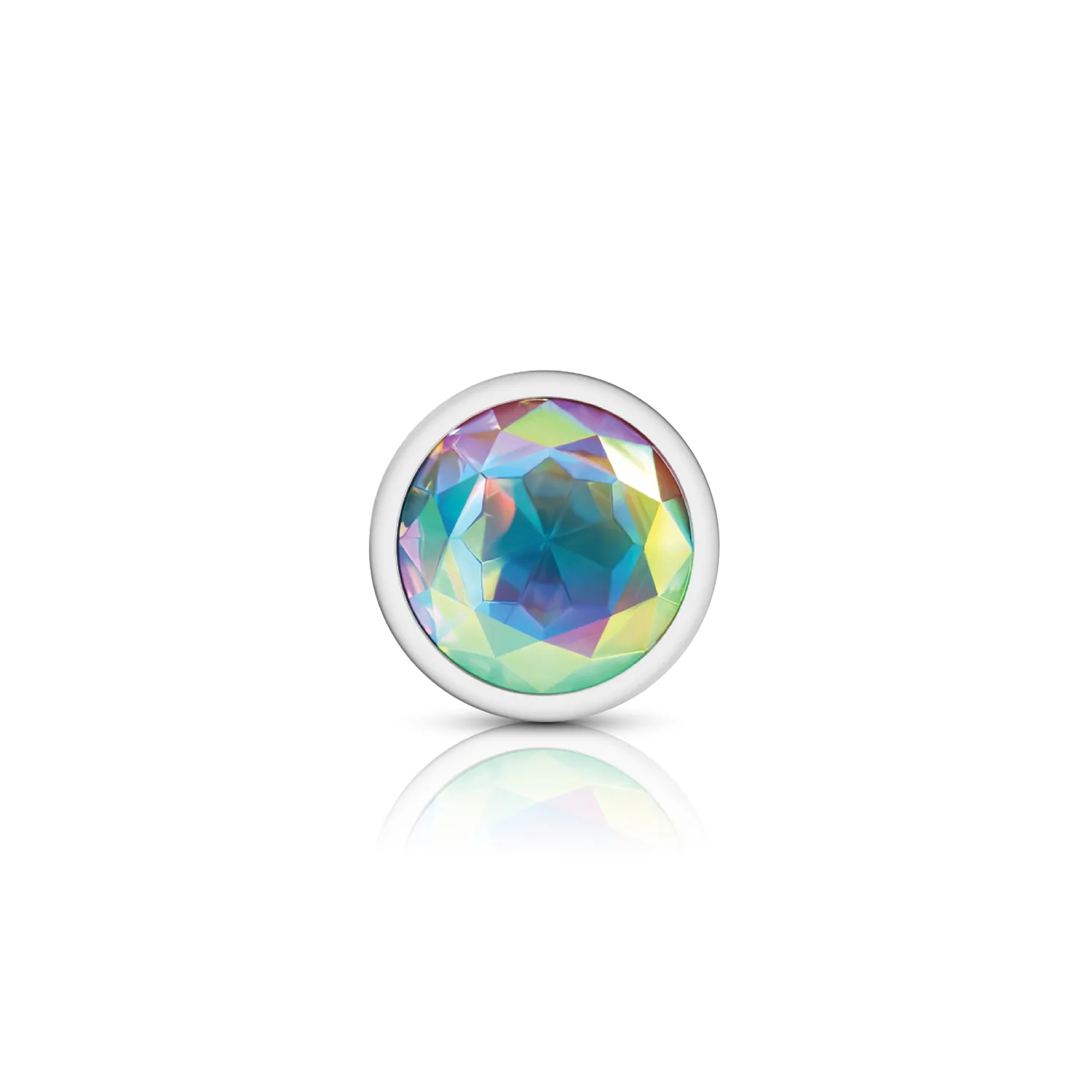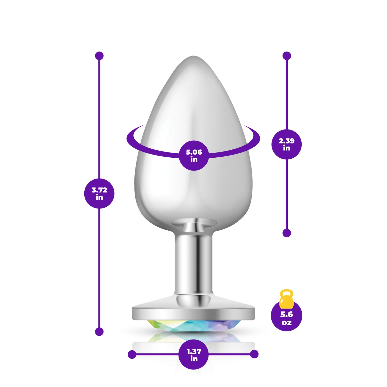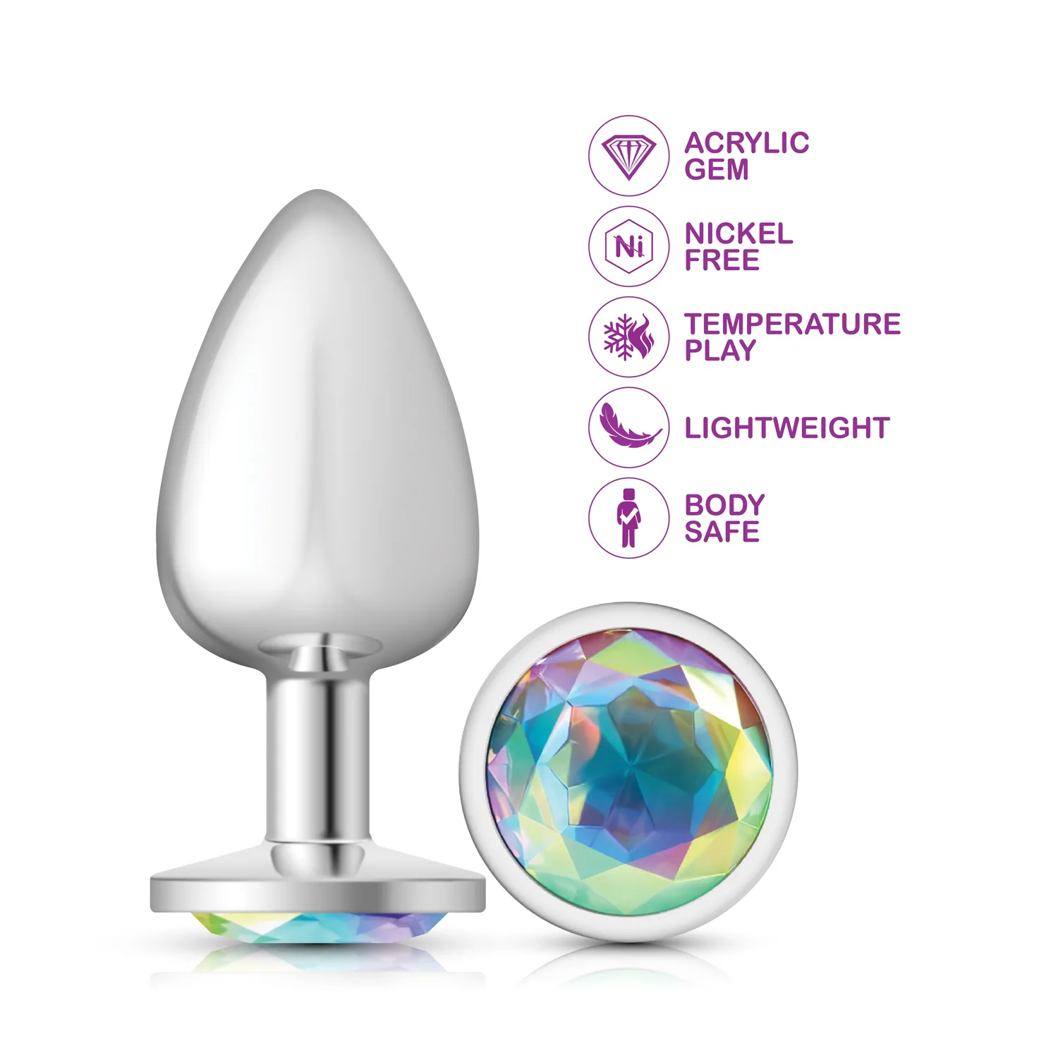 Large, silver metal, teardrop shaped anal plug with sparkling clear iridescent colored, round acrylic gemstone. Hypoallergenic, nonporous, body safe, nickel free, aluminum alloy, anal jewelry compatible with all lubricants. Easy to clean and dishwasher safe butt plugs.