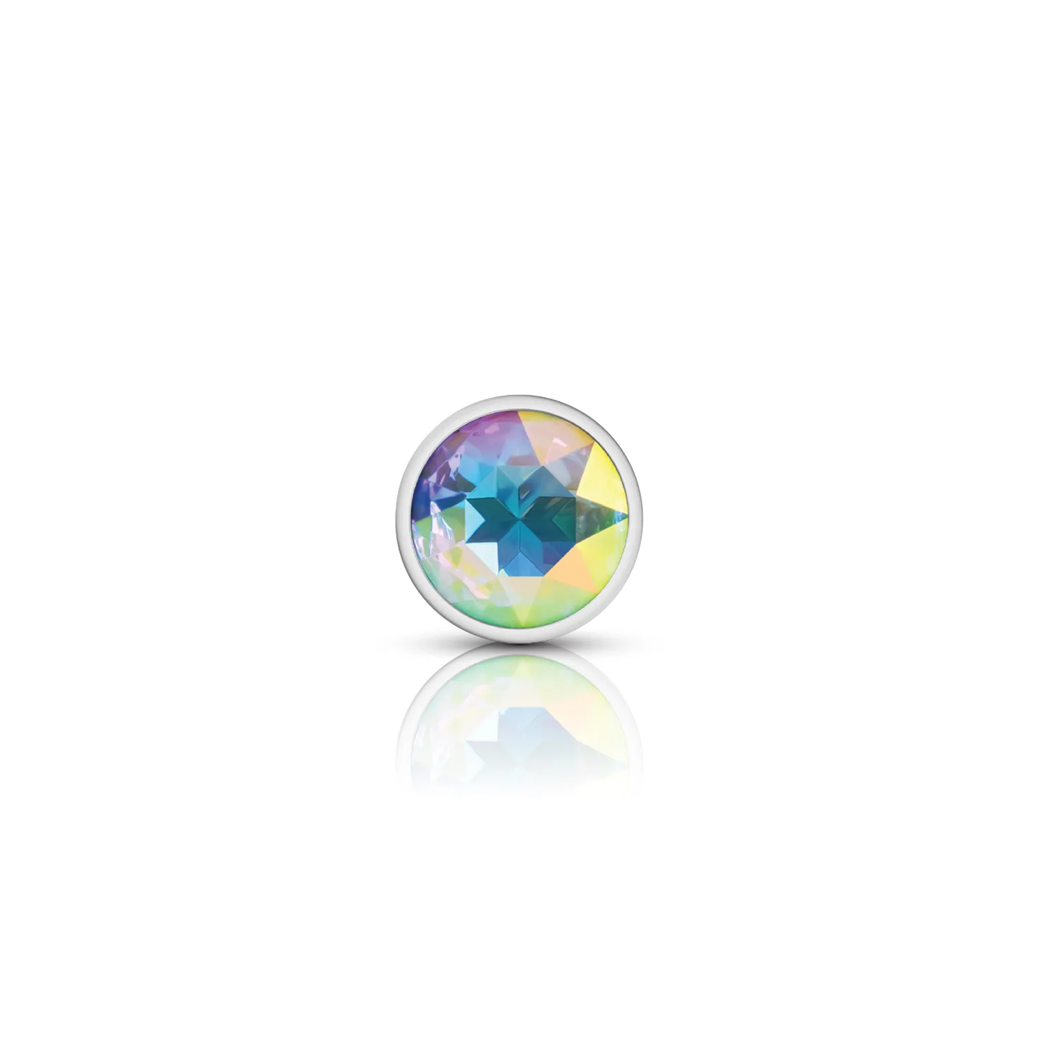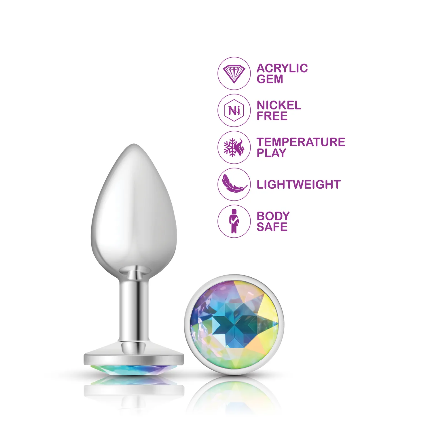 Small, silver metal, teardrop shaped anal plug with sparkling clear iridescent colored, round acrylic gemstone. Hypoallergenic, nonporous, body safe, nickel free, aluminum alloy, anal jewelry compatible with all lubricants. Easy to clean and dishwasher safe butt plugs.