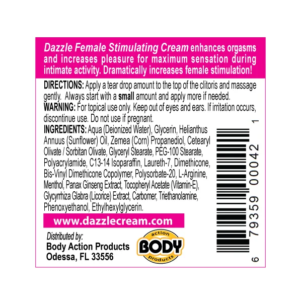Dazzle Female Stimulating Cream enhances orgasms and increases pleasure for maximum sensation during intimate activity. Dramatically increases female stimulation.