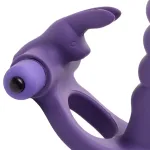 Prepare to experience pure delight! The innovative design of the Double Delight Vibrating Rabbit Ring provides amazing stimulation to both partners. Both the rabbit ring and insertable shaft house a powerful bullet which provides amazing vibration. Just place the rigid, semi stretchy silicone ring over the cock and balls. The rabbit stimulator will tickle and thrill her clit, while the ridged dildo penetrates her anally as you pleasure her with your cock. The vibration will travel from the ring into you as you thrust. The premium material has a smooth, matte finish that feels as good as it looks! This double penetration ring lets you take pleasure to a whole new level!
