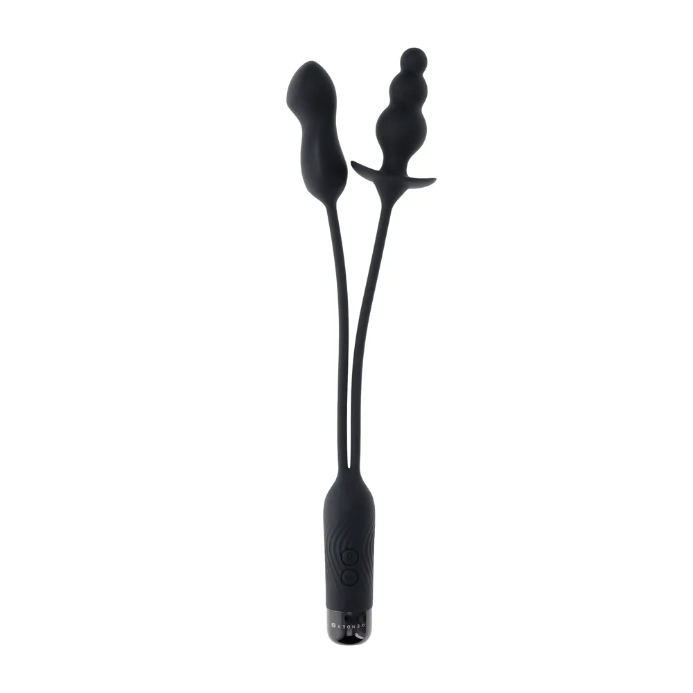 This double-motor toy features two vibrating shapes – a beaded plug and a mini vibe – each tethered by a flexible cord. The rounded-tip plug consists of 3 bulbs that gradually increase in size to a wide safery base. The chunky-shaped mini-vibe narrows at the center and finishes with a flattened, blunt tip. A USB plug is neatly stored under the textured handle’s screw-off cap.
