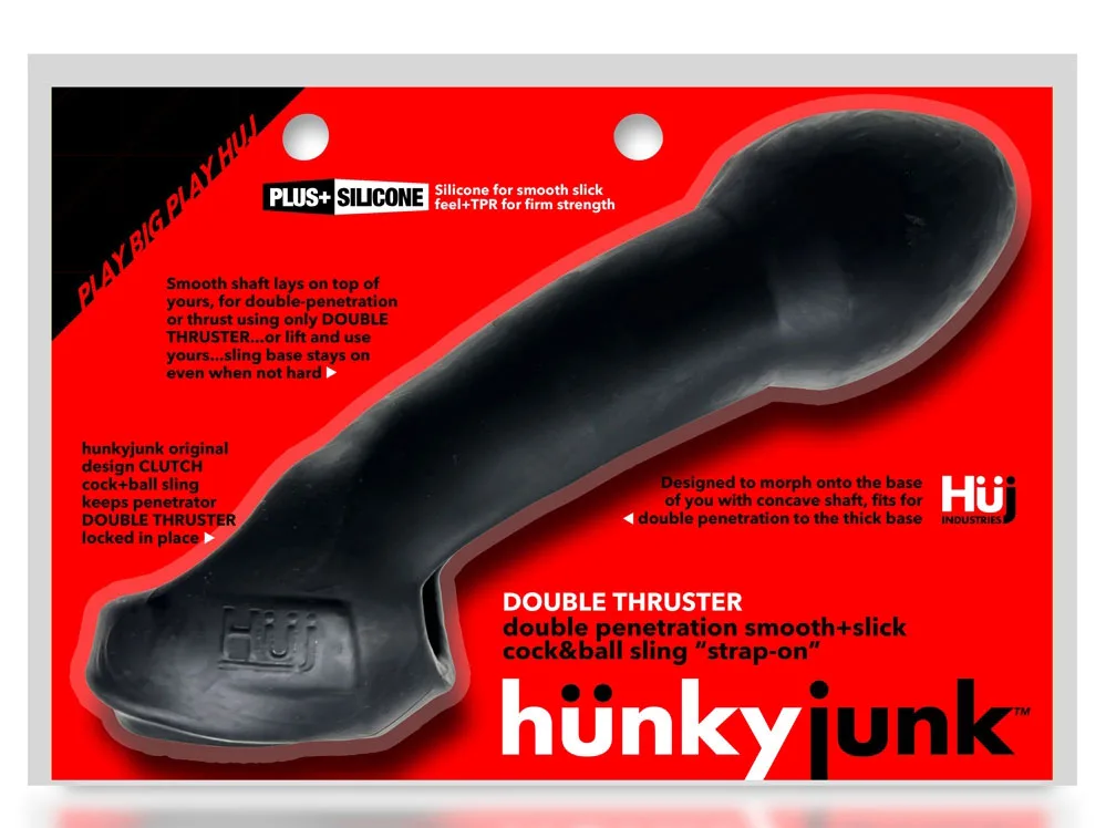 HunkyJunk original design clutch cock ball sling keeps penetrator Double Thruster lock in place. Sling base keeps it on for double penetration… or slide in it like a strap-on. Firm enough to use hard, squishy enough to fit right. Made of super-soft, smooth silicone blend.