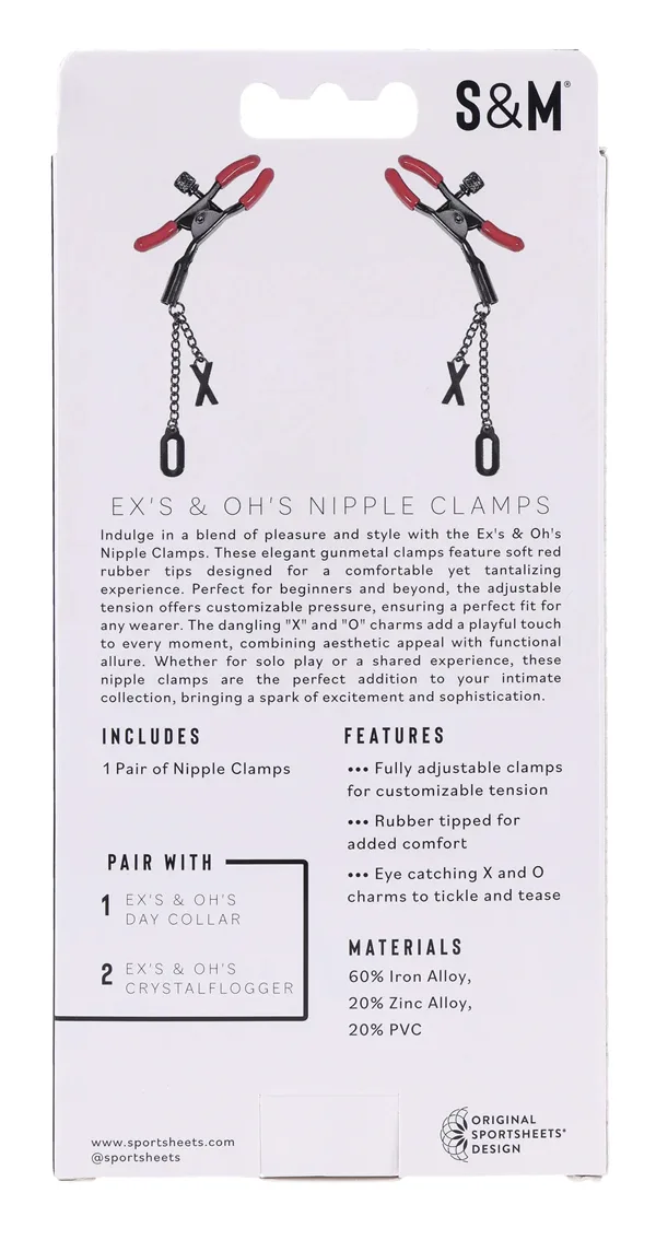 Indulge in a blend of pleasure and style with the Ex’s and Oh’s Nipple Clamps. These elegant gunmetal clamps feature soft red rubber tips designed for a comfortable yet tantalizing experience. Perfect for beginners and beyond, the adjustable tension offers customizable pressure, ensuring a perfect fit for any wearer. The dangling “X” and “O” charms add a playful touch to every moment, combining aesthetic appeal with functional allure. Whether for solo play or a shared experience, these nipple clamps are the perfect addition to your intimate collection, bringing a spark of excitement and sophistication.