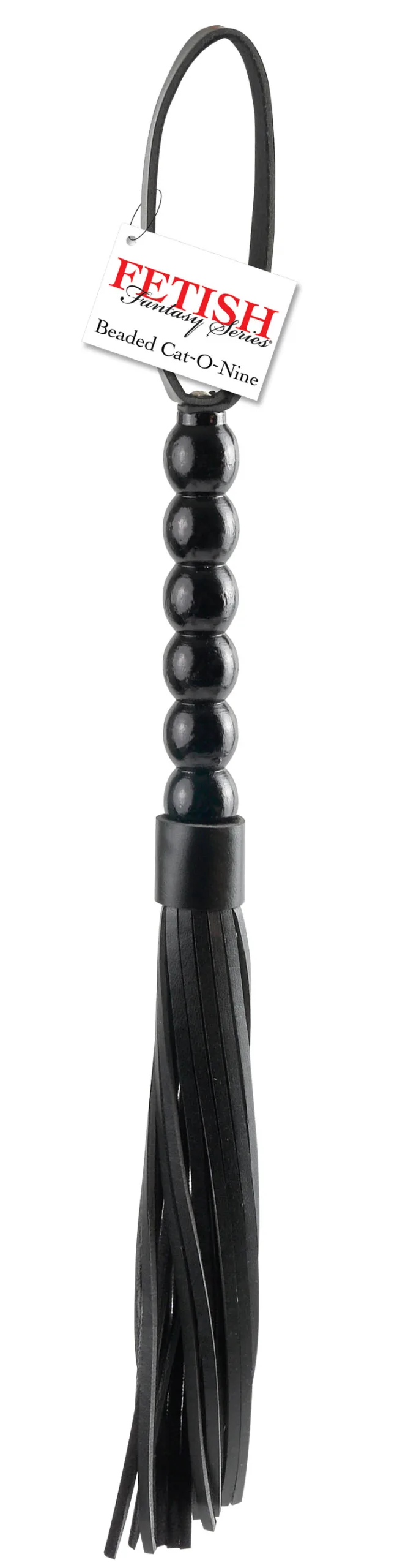 The wood bead handle has a handy strap and the tresses are an easy-to- use eight inches long. The strap and tresses are made of easy-to-clean soft-backed vinyl whose tips provide just the right amount of sting.