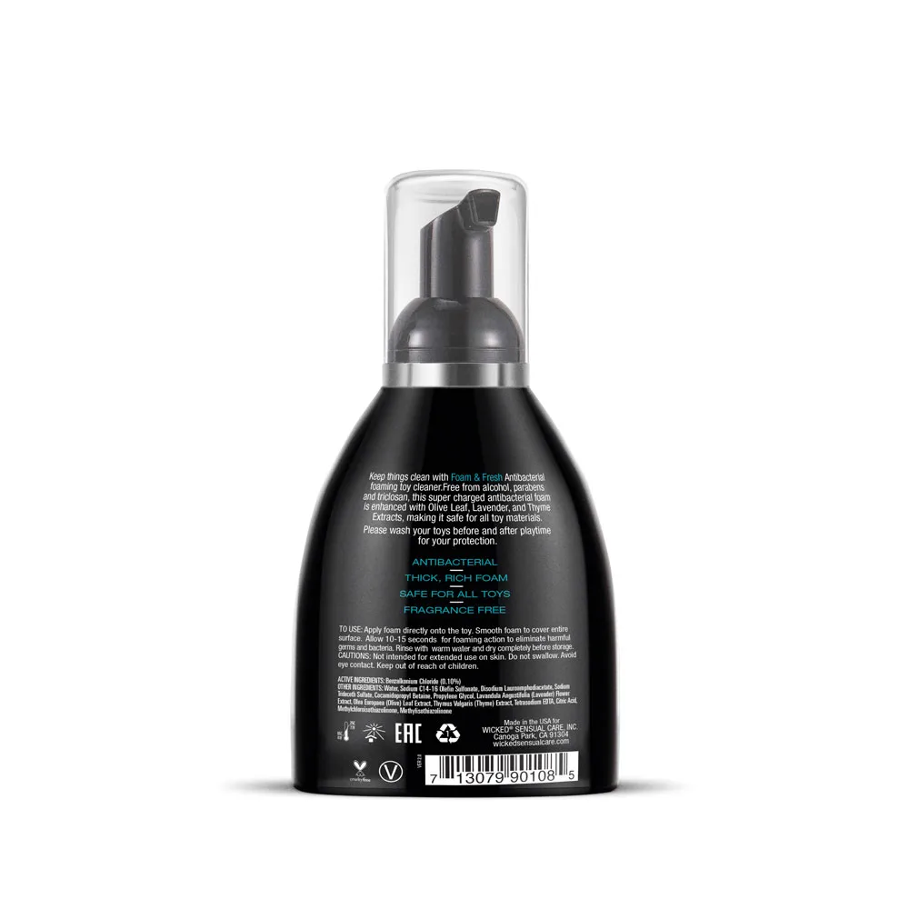 Playtime can get dirty, but your toys should always stay clean. Wicked Foam n Fresh is a toy and body safe alternative to everyday soap and water. Anti- bacterial, triclosan, and alcohol-free, this super powered foam is enhanced with Olive Leaf, Thyme and Lavender extracts, making it safe for all toy materials yet tough to germs. Use every time it’s time to sanitize, freshen, and protect your intimate investments. This cleaner is a must have for every toy box.