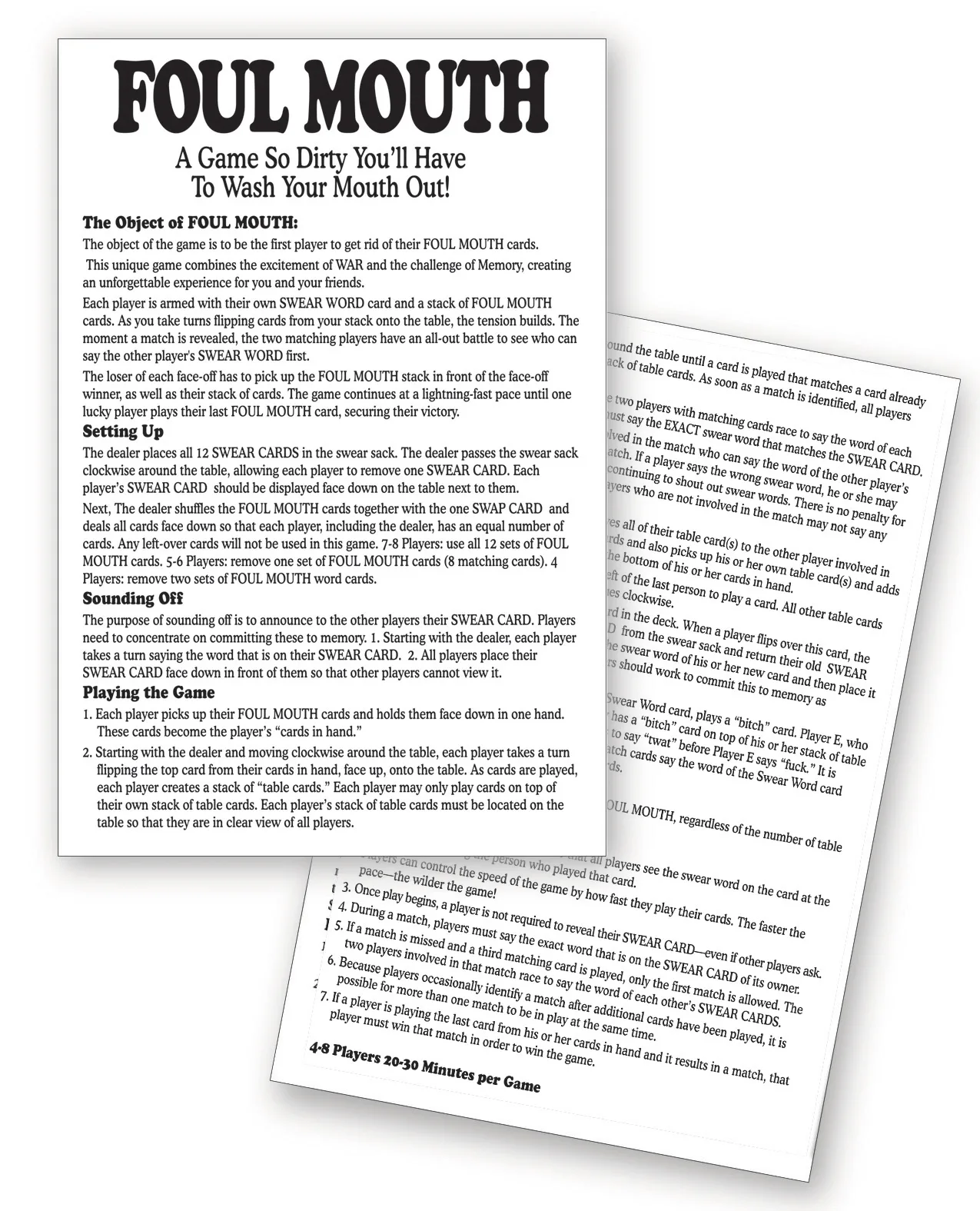 Each player is armed with their own SWEAR WORD card and stack of FOUL MOUTH cards. As you take turns flipping cards from your stack onto the table, the tension builds. The moment a match is revealed, the two matching players have an all-out battle to see who can say the other player’s SWEAR WORD first.