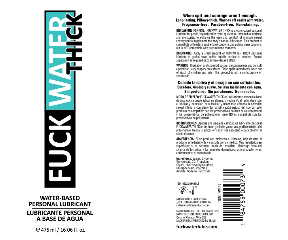 FuckWater Thick has added hydroxyethylcellulose, a 100% natural thickening agent to make it 5 times thicker than the FuckWater Clear formula, adding extra cushion and comfort during intimate moments. This specially designed formula is infused with vitamin E for moisture, made without desensitizers for soft tissue protection, and compatible with natural latex and polyisoprene condoms. This lube was made with pure plant source glycerin so it offers a silky smooth cover to make everything glide. With apply and go technology, FuckWater Thick will coat your tool or toys with a super slick and comforting layer. FuckWater Thick is fragrance-free, simple to use and easily cleans off your skin or sheets.