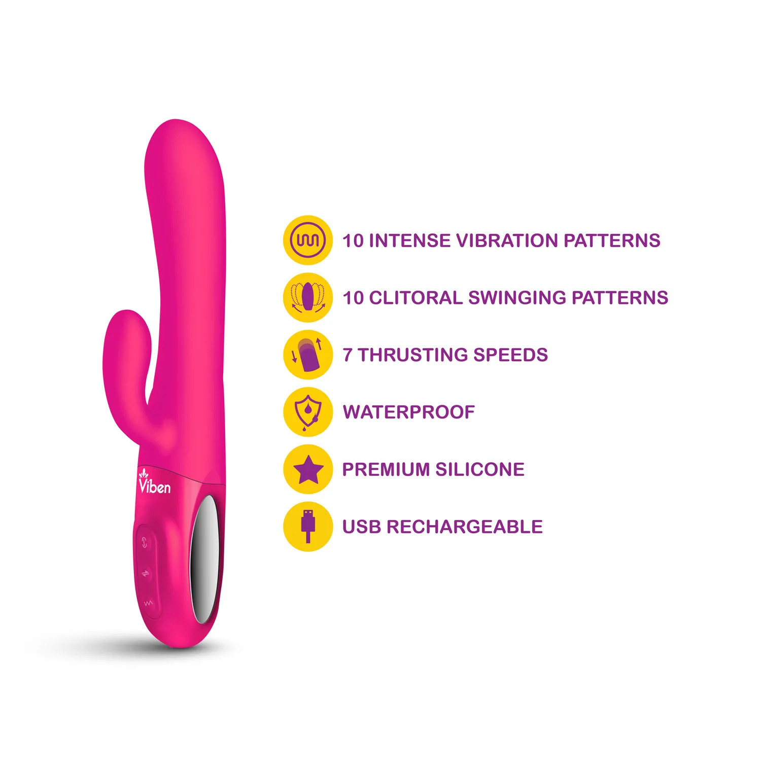 This triple threat is equipped with a vibrating, thrusting shaft, along with an external rabbit extension that both vibrates and swings against your clitoris. Each function can work independently and the memory chip resumes the last function used. Hold button for 3 seconds to turn on and off.