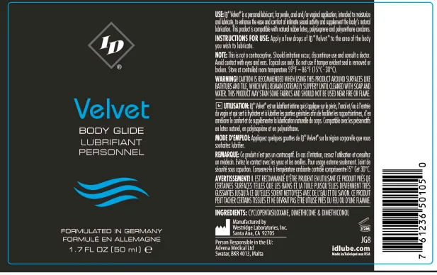 Formulated in Germany Id Velvet Body Glide is the most luxurious of all lubricants. ID Velvet is unique super premium formula is extra long latex compatible and fragrance free. Never sticky or tacky this velvet smooth lubricant also serves as a fantastic skin conditioner and moisturizer.