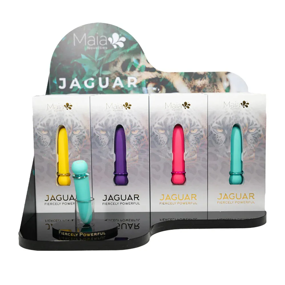The Maia Toys Jaguar offers 12 bullets plus 1 tester. Three of each color to include blue, pink, purple, yellow, and 1 additional tester. The Maia Novelties Jaguar is on the prowl. The JAGUAR features both elegance and power with a simple, 10-function design that sports 5 speeds and 5 vibrating patterns. Coated in 100% silicone with an IPX rating, the Jaguar is both body safe and fully submersible.
