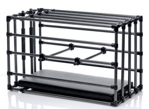 Immobilize your sub in your favorite position! The kennel is an adjustable cage with a padded board and optional positioning bars. Lock up your plaything within the coated metal enclosure and get creative! Trap their head between the front entrance bars with silicone padding so that they are perfectly positioned for force feeding. Leave in the comfortably padded leather-like board for extended role play sessions or remove it to punish a naughty pet. Positioning bars allow you to prop up their booty, feet, or chin, but you can also use them to keep their head, shoulders, and waist pushed down. Achieve the exact look that gets your blood pumping hardest! Attach their restraints, not included, to keep them in their place. This versatile cage makes an excellent addition to your dungeon or bedroom, creating a striking image as soon as your partner lays eyes on it. Assembly instructions are included.