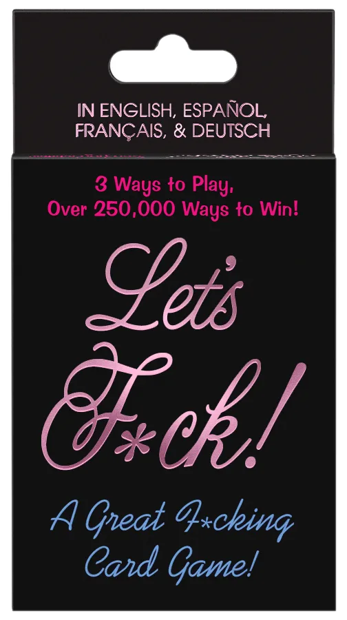 The quick and easy game that gets you laid! Includes 48 Let’s F… Cards, 4 Let’s Fck Wild Cards, and rules for 3 games: Fck Fortunes, Match & Fck, and Personal Fck Questions. One size fits most.