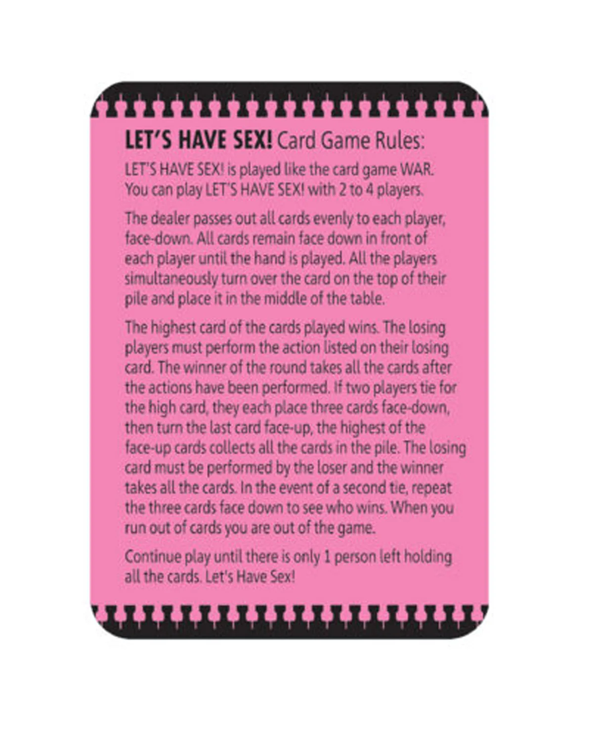 Let’s Have Sex is a game of sexual adventure. Battle your opponent by flipping over your cards to see who has the highest rankinig card. When you win, you can perform our choice of action on the cards played. Who will have the most satisfying sex? As a prelude, try playing the Lets Get Naked card game for extra sexy fun.