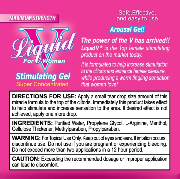 Formulated in a thick gel that will not become runny or messy Liquid V gently lubricates and encourages greater blood flow with powerful ingredients like LArginine and adds a cool tingling effect with menthol. This water- based gel can be used along with condoms and is also compatible with all adult toy materials for use whenever extra excitement is desired.