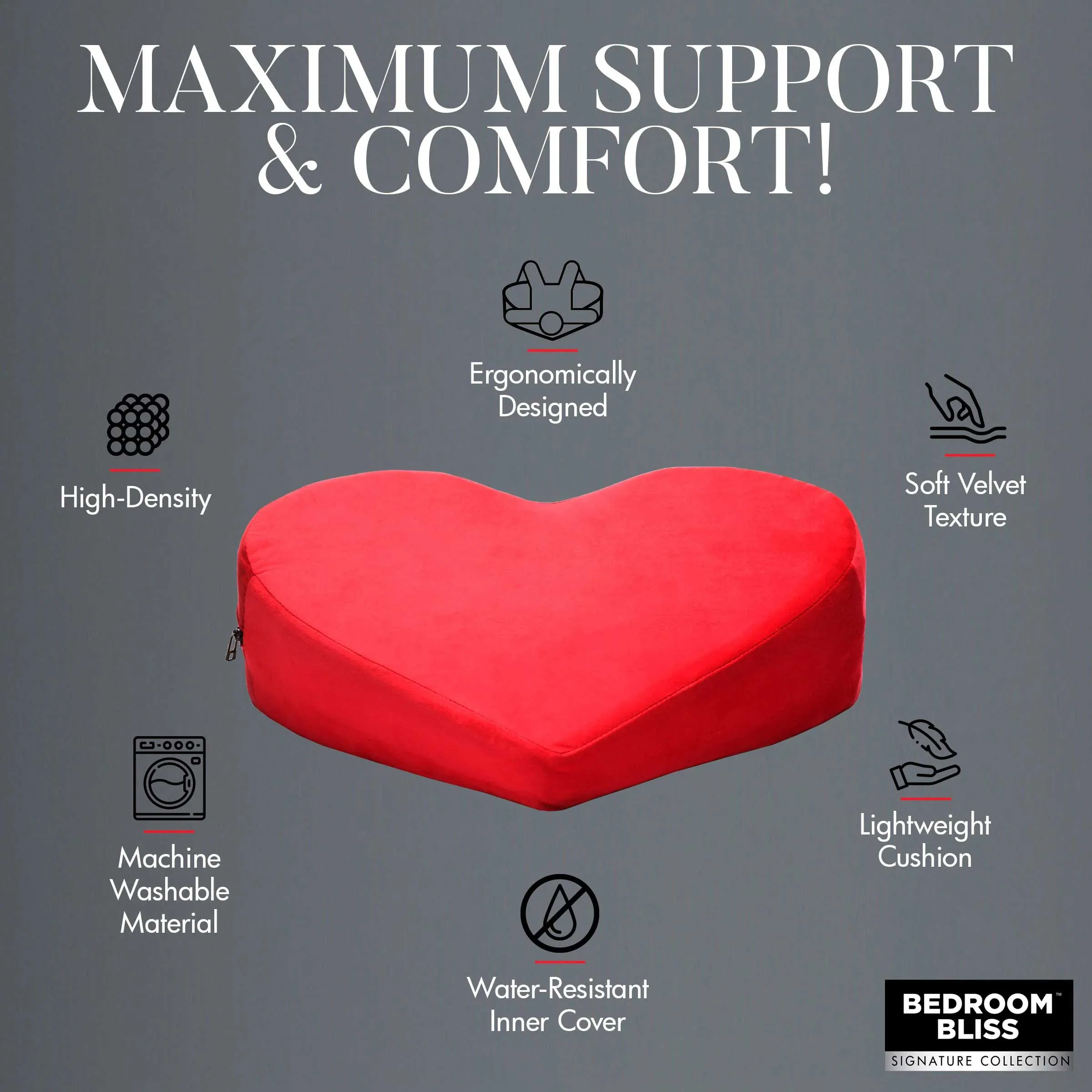 A little lift goes a long way with this heart shaped pillow! Made of high-density foam and covered in a velvety soft outer layer and a water-resistant inner layer, it’s firm enough to lift you up and has enough softness to keep it sexy. Use it under your shoulders, chest, head, hips or knees to change the way you play! Both inner and outer pillow covers are machine washable, too! The soft outer layer keeps it sexy and sensual as your skin brushes against the fabric while the water-resistant, inner layer keeps your foam pillow moisture free!