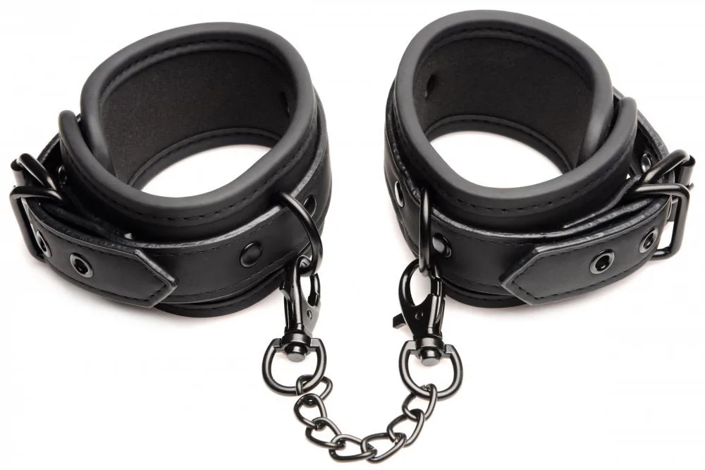 Take your relationship to the next level with this 10 Piece Bondage Set! The set includes wrist cuffs, ankle cuffs and a collar. Enjoy attaching the nickel-free metal chains to each of the cuffs to bind them, and then attach the metal chain leash to their collar to lead them around! The straps on all of the cuffs and the collar are made of vegan-friendly, comfortable PU leather and are easy to adjust using the buckle closure. Add some more fun into your evening with more goodies included! This kit also introduces you to sensation play and light impact play! Enjoy trying out the flogger or paddle on their backside or lightly against their chest while they are blindfolded and gagged. Use the blindfold to enhance their sensitivity and awareness to touch. Use mouth gag has holes in it to improve breathability and can also enhance your sexual experience!