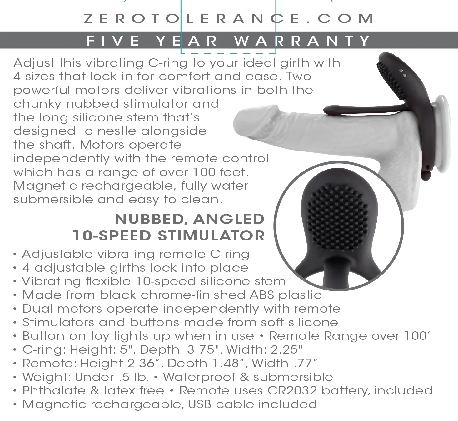 Adjust this vibrating C-ring to your ideal girth with 4 sizes that lock in for comfort and ease. Two powerful motors deliver vibrations in both the chunky nubbed stimulator and the long silicone stem thats designed to nestle alongside the shaft. Motors operate independently with the remote control which has a range of over 100 feet. Magnetic rechargeable, fully water submersible and easy to clean.