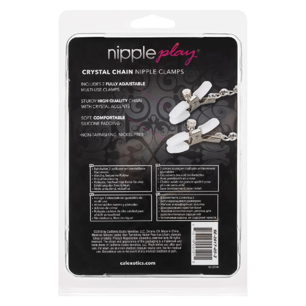 Play Crystal Chain Nipple Clamps. Explore elevated sensation with the 2 fully adjustable nipple clamps, teasing chain and sparkling crystals. Reach new levels of playful pleasure with the adjustable clamps. Clamp the naughty clasps to your body and enjoy every rush of pain and pleasure.