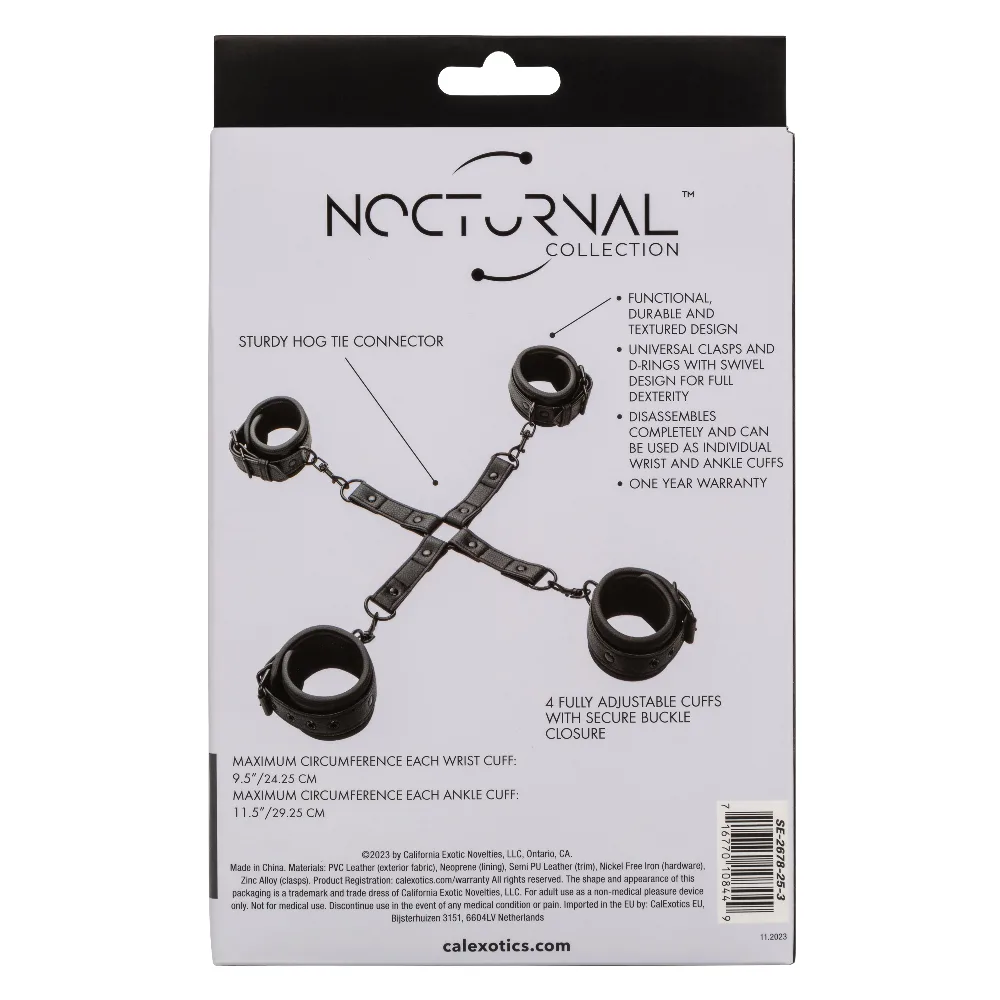 Versatility is another hallmark of this collection. The hog tie can be disassembled completely, allowing the cuffs to be used individually as wrist or ankle restraints. This multifunctional aspect makes it a valuable addition to any collection, suitable for both beginners and seasoned practitioners alike. Whether used as a cohesive unit or as separate components, the Nocturnal Collection Hog Tie promises an experience that is the perfect blend of form, function, and fantasy.
