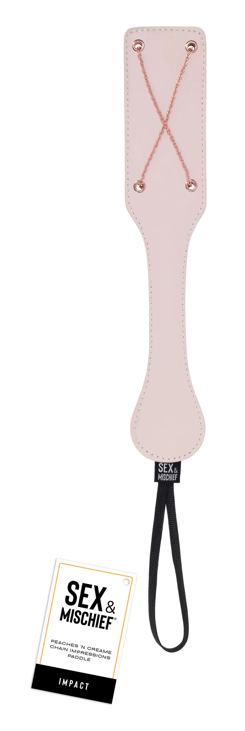 Choose your own pleasure. The Peaches N CreaMe Chain Paddle is crafted from soft, smooth faux leather with detailed saddle-stitching and sealed edges for lasting durability. One side features crisscrossed rose gold chains for bold texture, marking the skin with intent, because X always marks the spot. The other side offers a smoother chain-lined surface for a gentler touch. From a stinging tease to sharper correction, deliver every strike with purpose. A secure wrist loop ensures a steady grip, easy storage, and even easier surrender.