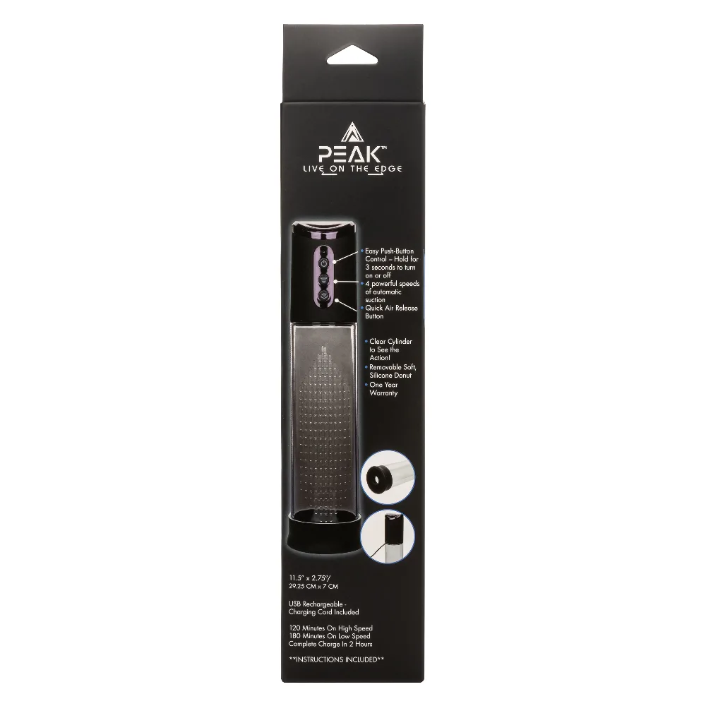 The clear cylinder allows you to see the action, adding an element of visual excitement to your experience. For ease of use and convenience, the pump features an easy push-button control and a quick air release button. Disassembling for cleaning is effortless, ensuring hygiene and longevity. USB rechargeable, with a complete charge achieved in just 2 hours, the pump can run for 120 minutes on high speed and 180 minutes on low speed. Boost your enjoyment with the Peak Rechargeable Pump, a modern device carefully created to take your experiences to their highest peaks.