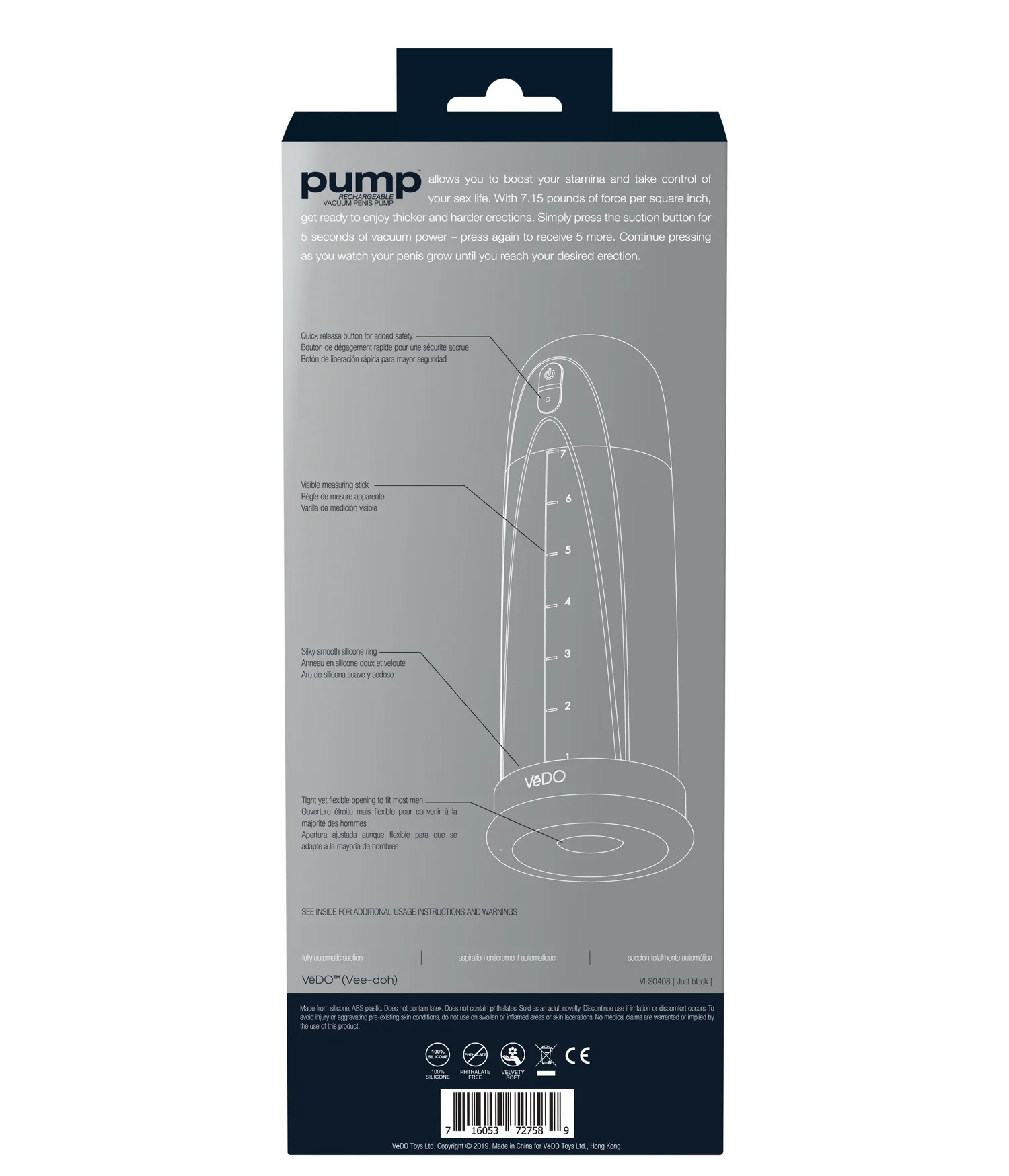 Pump allows you to boost your stamina and take control of your sex llife. With 7.15 pounds of force per square inch, get ready to enjoy thicker and harder erections. Simply press the suction button for 5 seconds of vacuum power – press again to receive 5 more. Continue pressing as you watch your penis grow until you reach your desired erection.