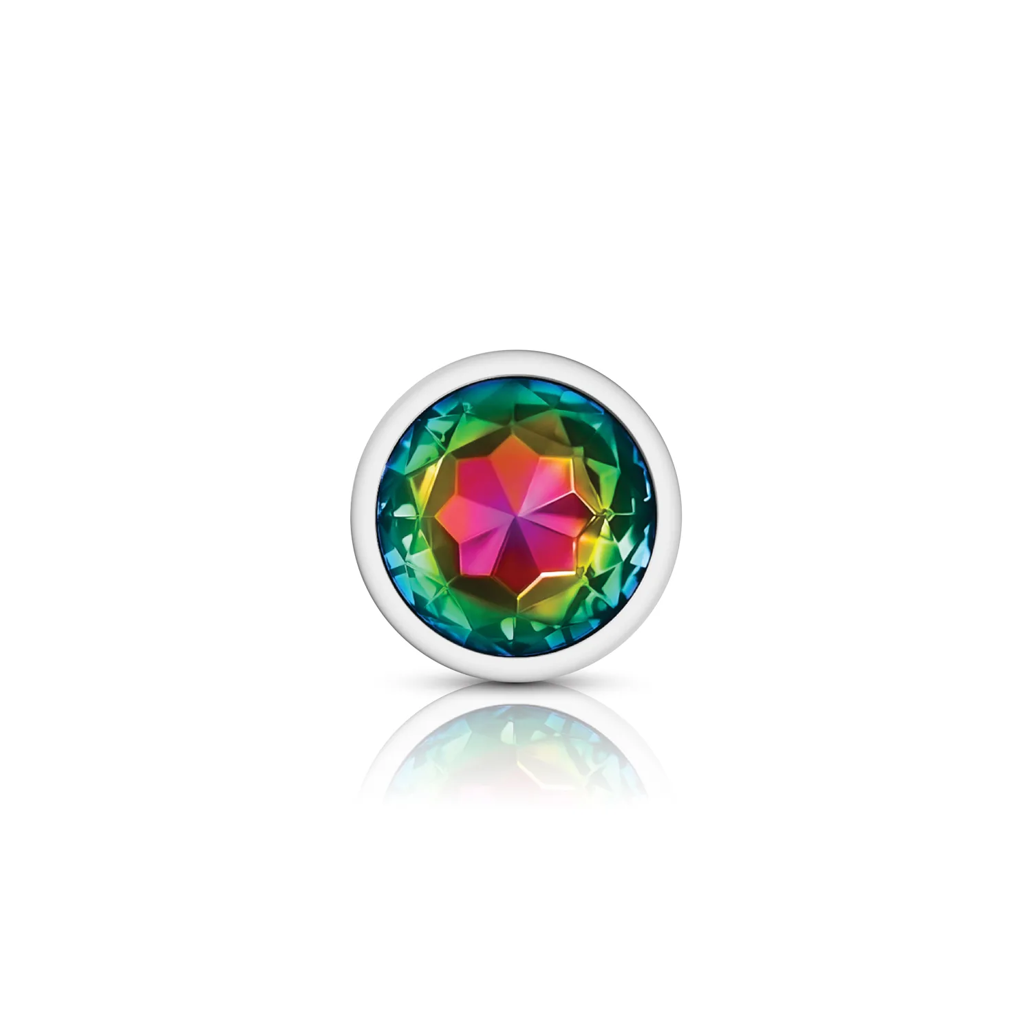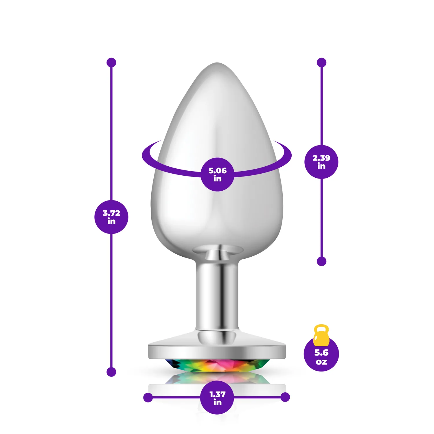 Large, silver metal, teardrop shaped anal plug with sparkling rainbow colored, round acrylic gemstone. Hypoallergenic, nonporous, body safe, nickel free, aluminum alloy, anal jewelry compatible with all lubricants. Easy to clean and dishwasher safe butt plugs.