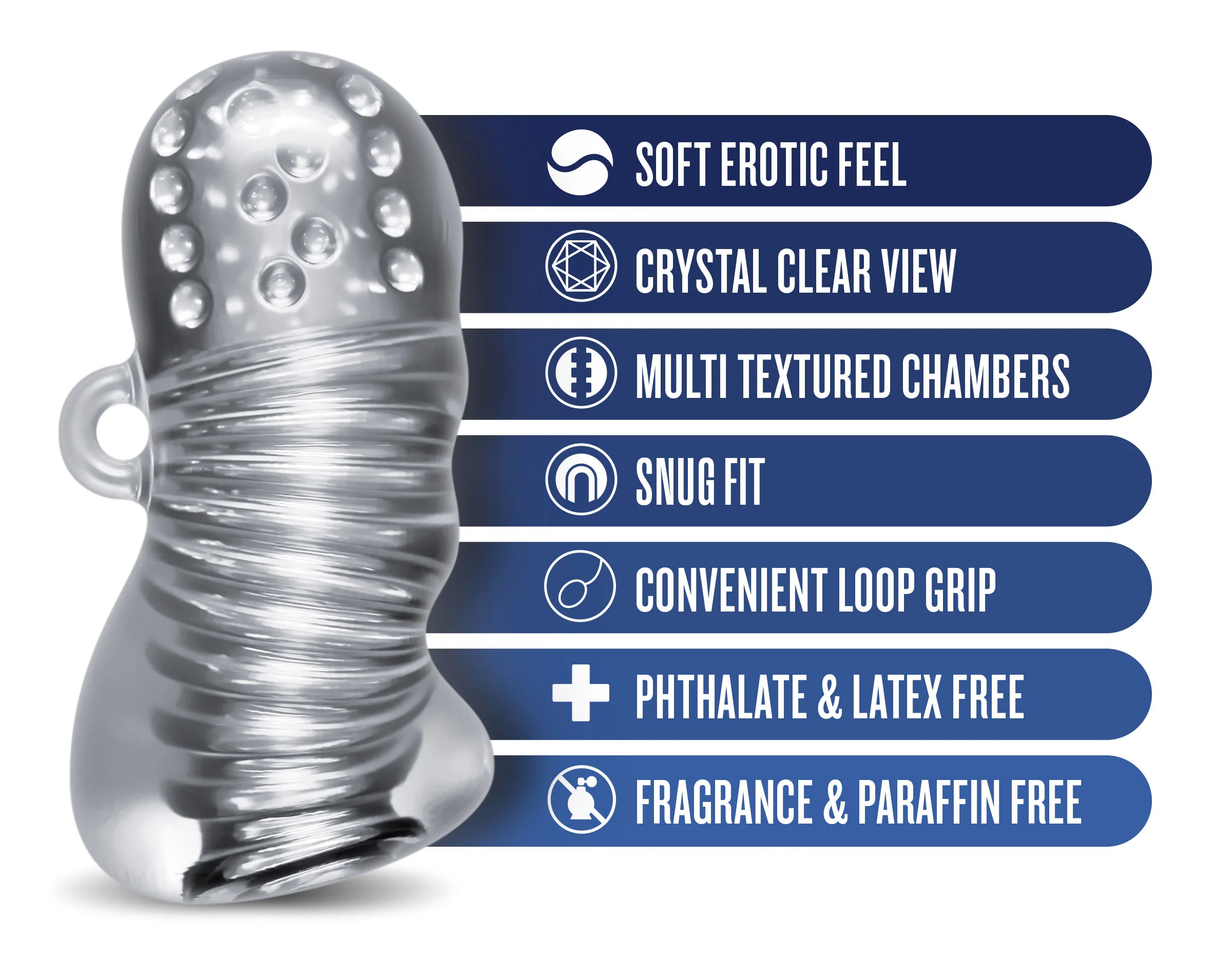 The RIZE! Squeezy is designed for maximum comfort and to achieve optimal levels of personal performance. Add a little bit of your favorite lube and enjoy the snug grip as the multi-textured chambers create an incredible array of sensations. The no-slip handle and finger grips on the outside keeps everything under control. Squeezy is crystal clear for a great view of the action! Its easy to clean, contains no phthalates, paraffins, or latex.