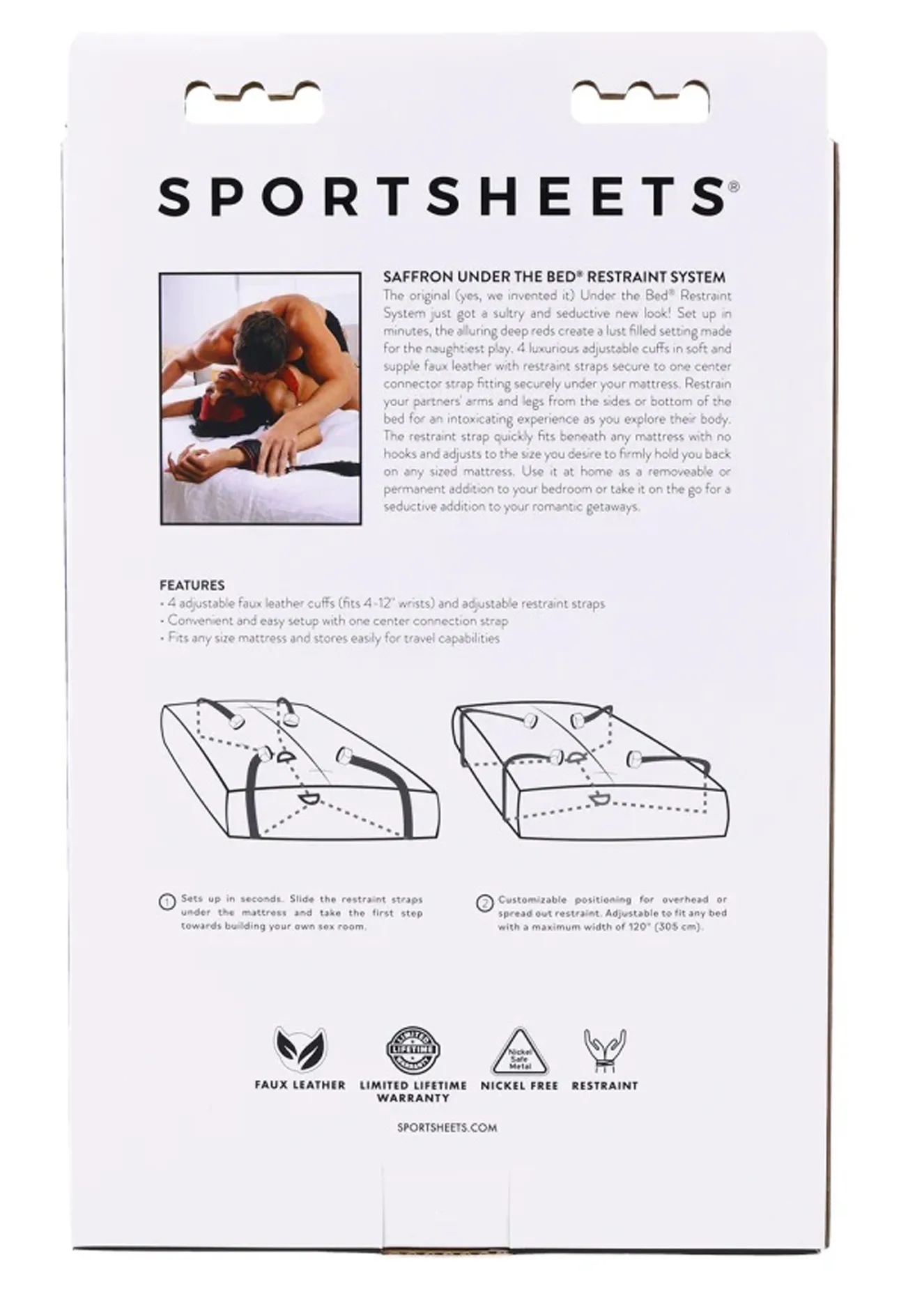 The original (yes, we invented it) Under the Bed Restraint System just got a sultry and seductive new look! Set up in minutes, the alluring deep reds create a lust filled setting made for the naughtiest play. Four luxurious adjustable cuffs in soft and supple faux leather with restraint straps secure to one center connector strap fitting securely under your mattress.