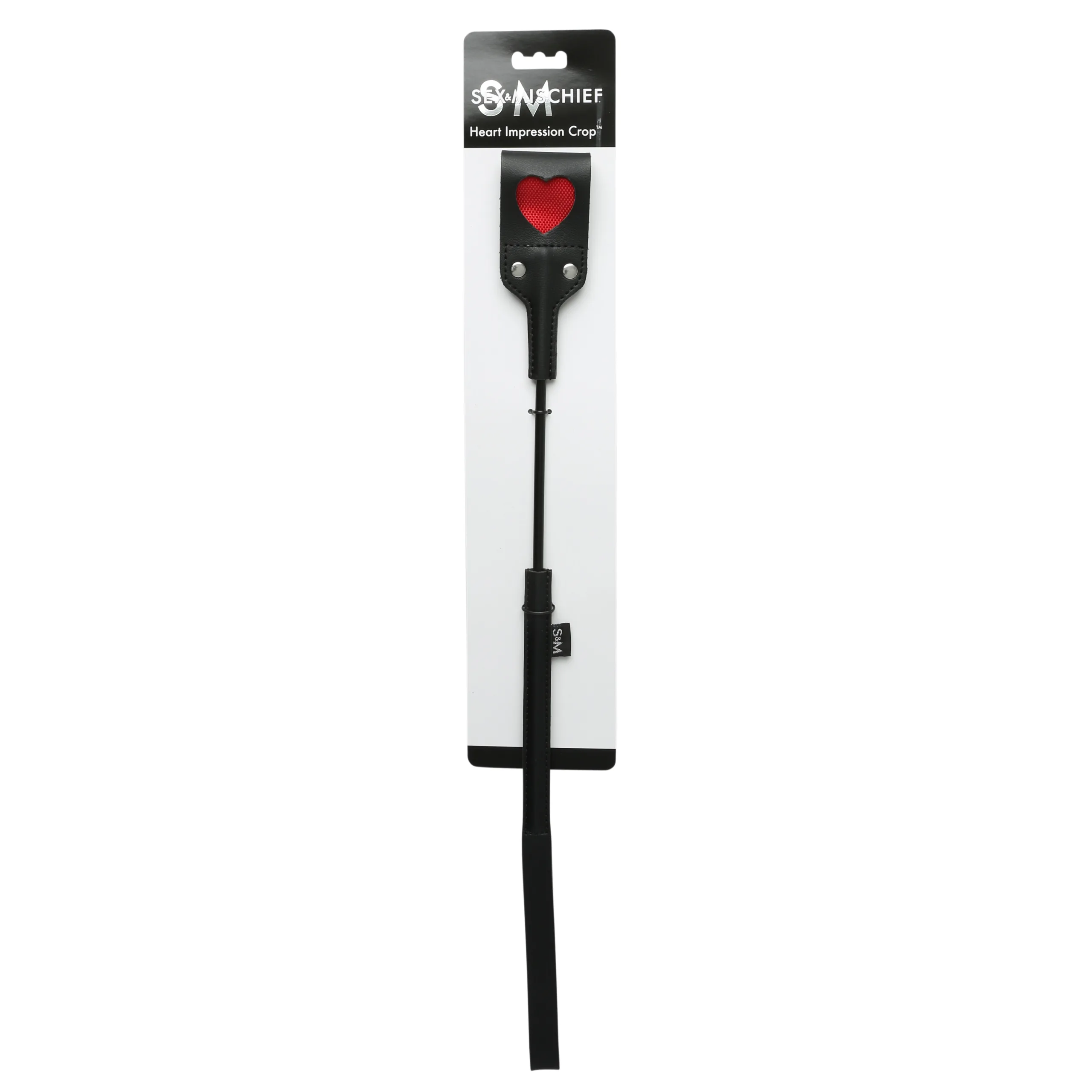 Feel the love with the Sex & Mischief Heart Crop. With the heart cut-out, you’re sure to leave your love note on your partner’s skin. The black wand is complete with a black wrist strap. Hardware is nickel-free.
