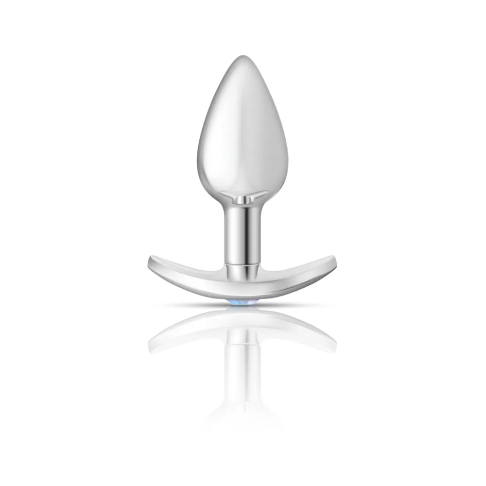 Small, silver metal, teardrop shaped anal plug with dazzling, interchangeable anchor bases. Hypoallergenic, nonporous, body safe, nickel free, aluminum alloy, anal jewelry compatible with all lubricants. Easy to clean and dishwasher safe butt plugs. Each kit has a clear iridescent gem with the choice of either a bright pink or teal blue acrylic gemstone anchor base.