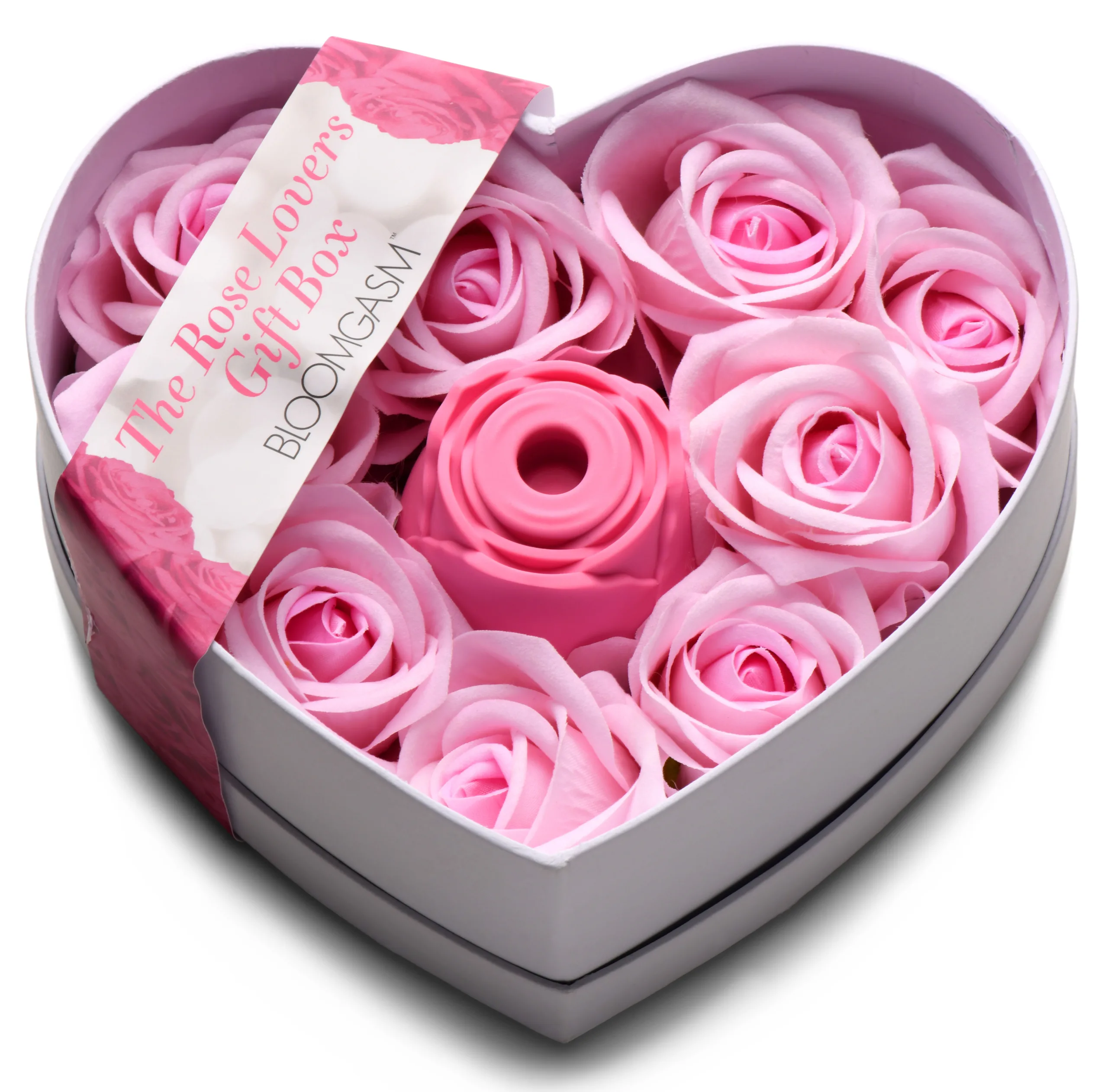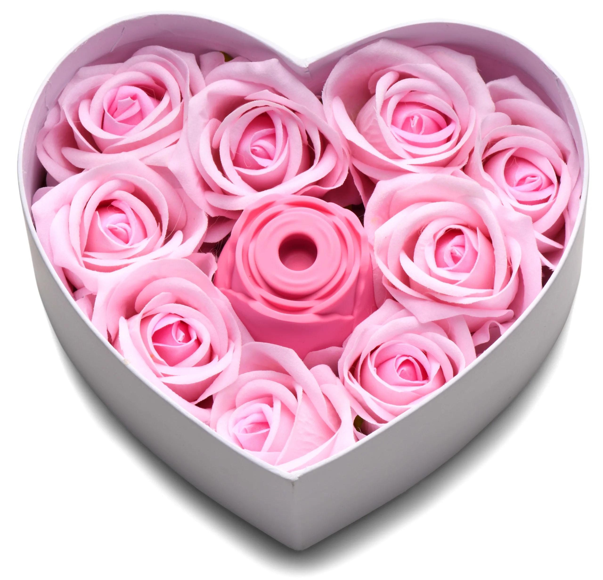 Give your lover a gift that shows class, style and thoughtfulness! This sucking rose clit stimulator is surrounded by roses and placed in the center of a heart-shaped box! Carefully curated to let your partner know that you love them so much you want them to have lots of orgasms! The powerful rose nestled in this bouquet offers 3 intensity levels and 7 patterns. With air-stim technology that gently sucks at the clit, this kind of stimulation will send them over the edge of ecstasy! Made out of silky smooth silicone, it is also phthalate-free and body-safe. Use only with water-based lubricants! Want to get even wetter? Take this waterproof toy into the shower or bring it into the bathtub! It can be submerged under water for up to 30 minutes without issue. Recharge using the magnetic charging base and let your rose perch in place like a posed decoration!