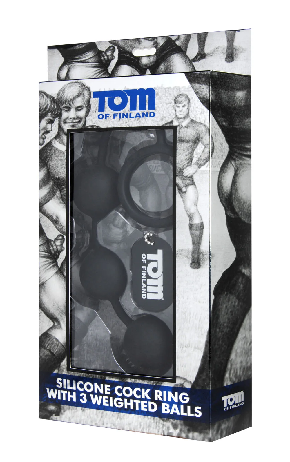 This set of silicone-coated heavy weighted balls are attached to a firm cock ring, for anal stimulation coupled with erection enhancement. Each weighty ball is smooth and seamless, tethered by a strong silicone cord. Non-porous and body-safe, the silicone material cleans easily and is ideal for long-term wear. The cock ring is thick and effective, with a slight give while