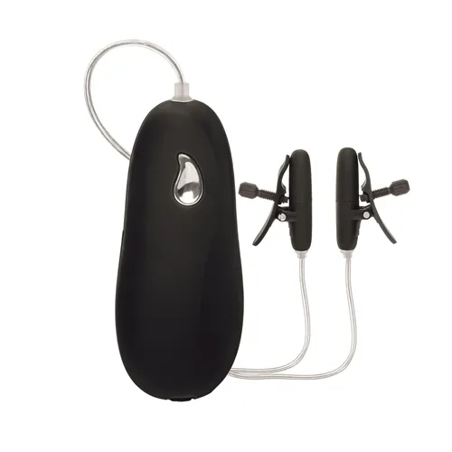 Non-piercing, petite, adjustable nipple clamps that warm as they vibrate. Fully adjustable multi-use clamps. High intensity motor with 2-speed push-button control. Warms to an incredible 104 degress Fahrenheit.